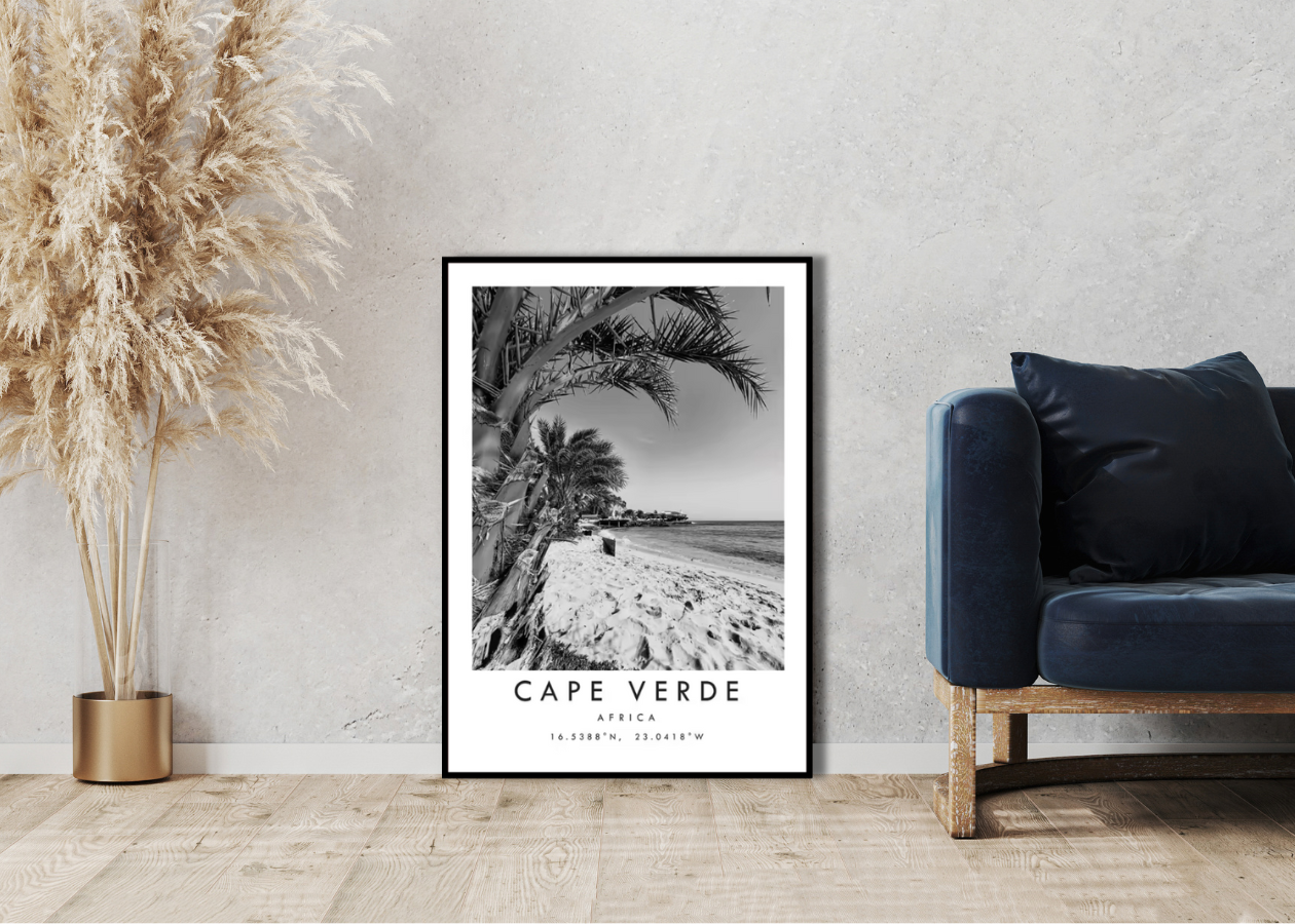 L'affiche Cap-Vert s'harmonise parfaitement avec d'autres éléments décoratifs, comme des cadres en bois, des plantes vertes ou des coussins aux couleurs neutres.