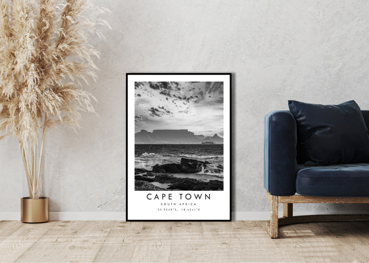 L'Affiche Cape Town s'harmonise parfaitement avec d'autres éléments décoratifs, comme des cadres en bois, des plantes vertes ou des coussins aux couleurs neutres.